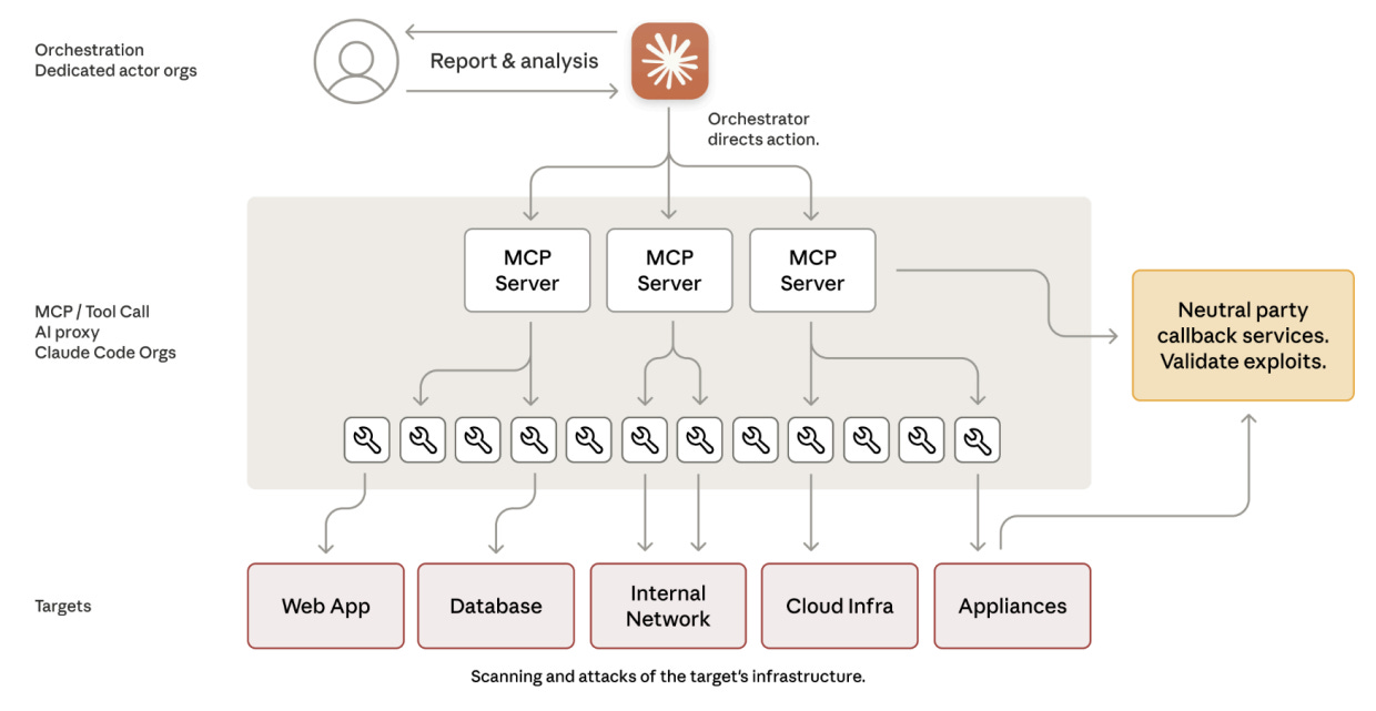 The infrastructure combined Claude Code, multiple Model Context Protocol (MCP) servers, and ordinary penetration-testing tools orchestrated into an automated attack framework (p.6).